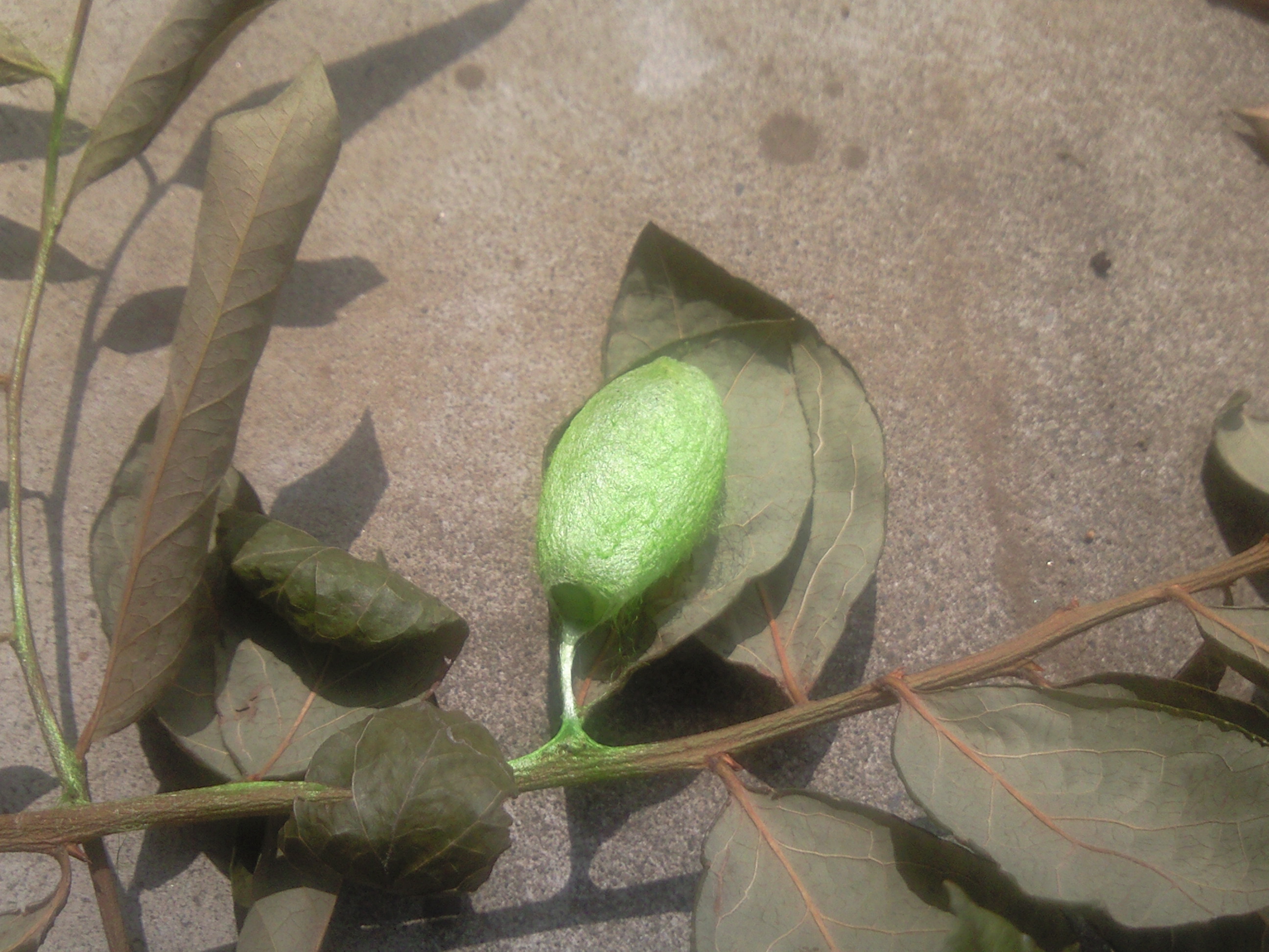 それはそれは美しいキャベツ色のイモムシを庭で発見したので、そっと籠に入れておいたら、美しい黄緑色の『繭』になった。